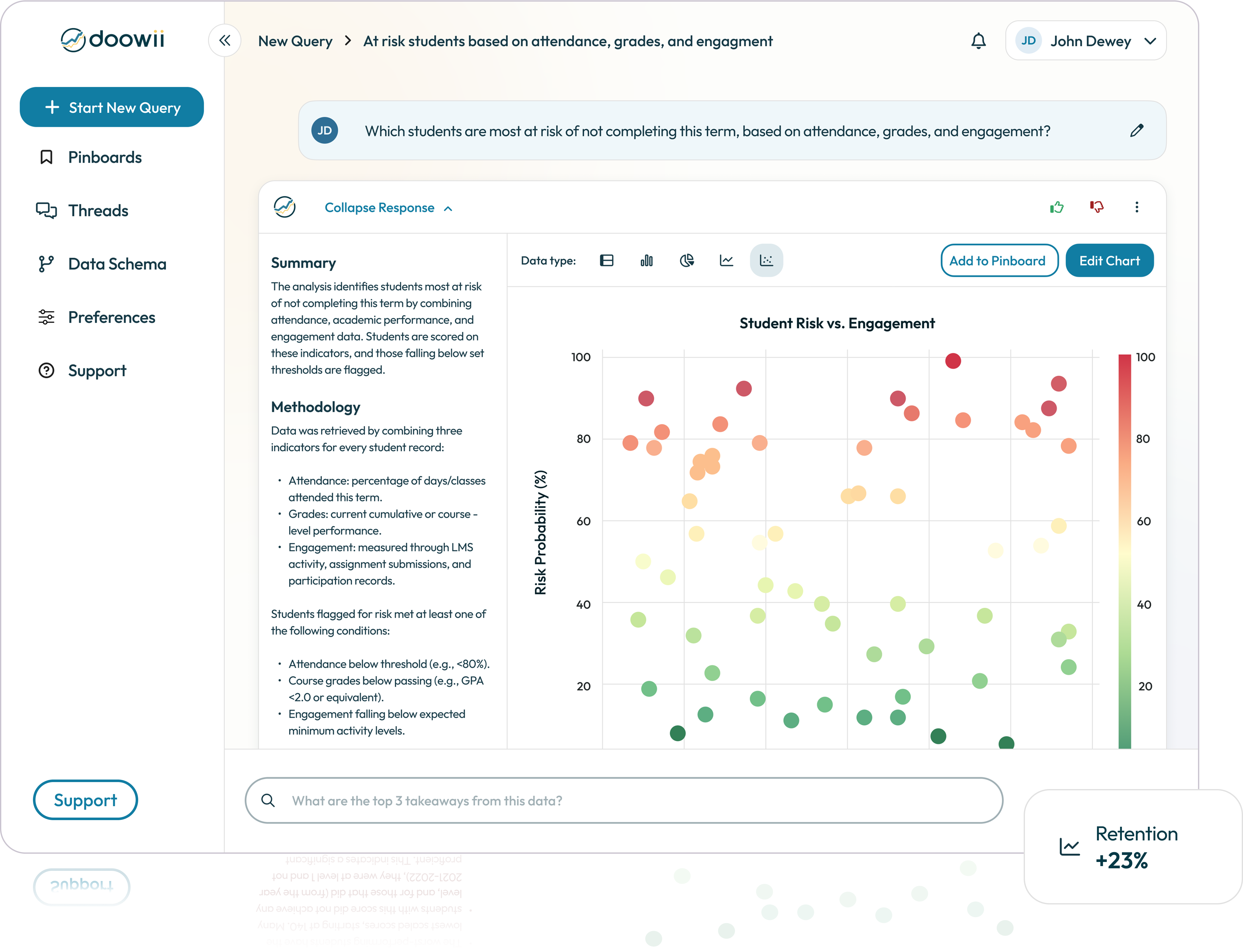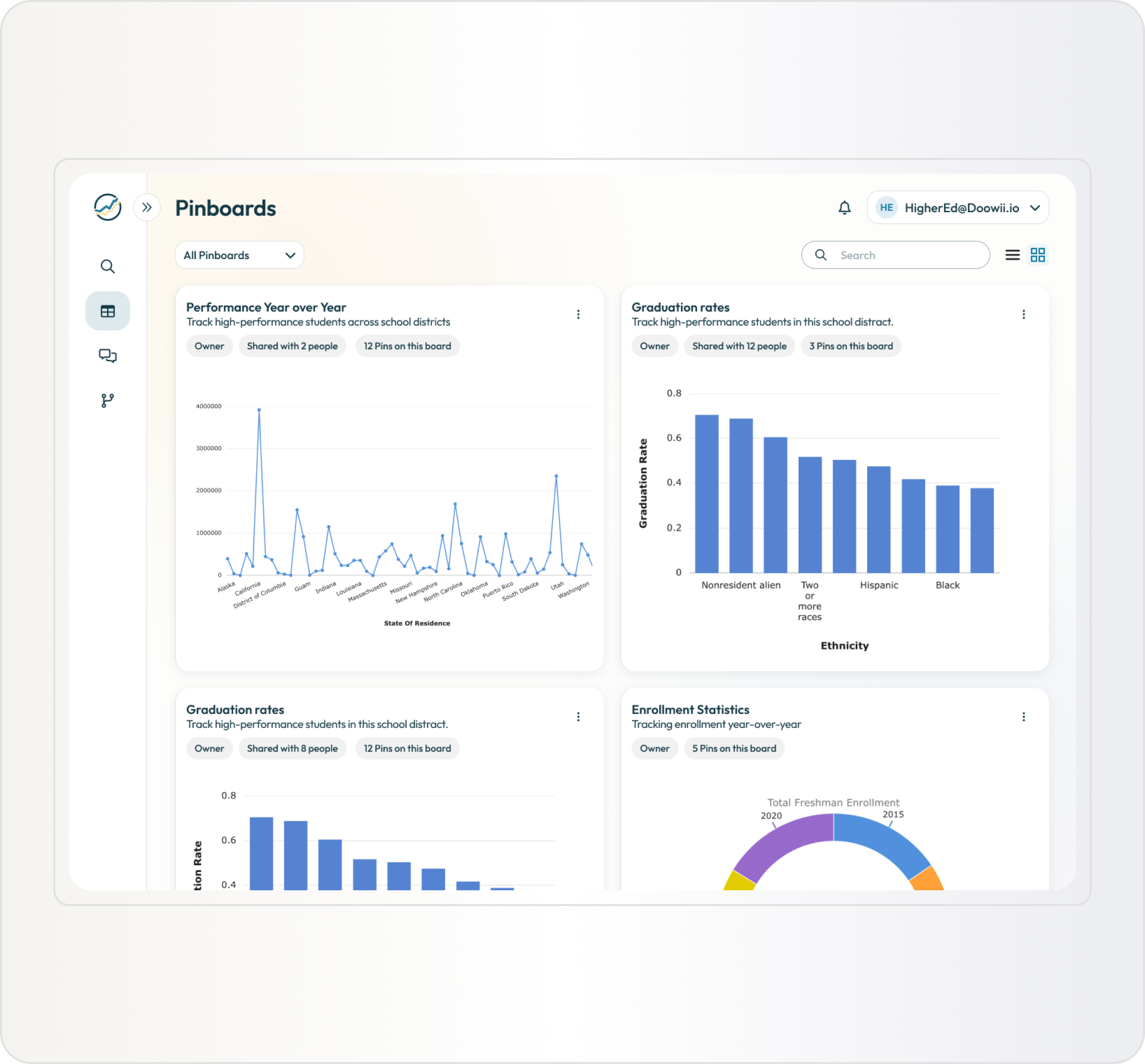 Doowii empowers education institutions to uncover insights by using existing information. Use our AI based platform to consolidate your data sources in one place. Get answers fast, share them with colleagues. No data analytics teams necessary.